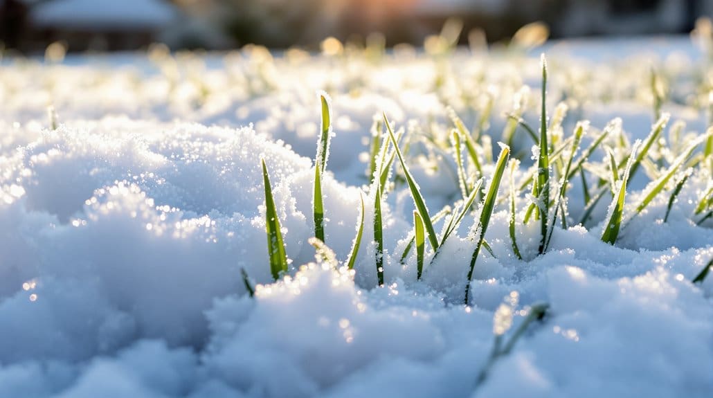 Often you’ll find that a modest blanket of snow is one of your lawn’s best winter allies, because it acts like a natural insulating layer that keeps the soil and grass crowns—those low-growing growth centers at the plant base—closer to just above freezing, so dormancy holds steady instead of cycling through damaging freezes and thaws. You’ll see soil temperature stay steadier under 2–4 inches of fresh snow, insulation that cuts harmful freeze–thaw cycles and reduces frost heaving that can expose turf crowns and roots. Now, this is where winterization matters: aerate and avoid late high-N fertilizer so crowns are healthy, because long-lasting compacted snow or ice can block gas exchange and cause crown damage or winter desiccation, so don’t habitually remove fresh snow. Proper seasonal care and using soil amendments at the right times helps maintain healthy turf and better winter resilience.